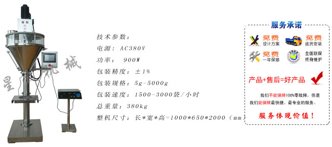 4.包裝范圍寬:同一臺定量包裝機在5-5000g內通過電子秤鍵盤調整及更換不同規格的下料螺旋連續可調