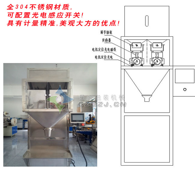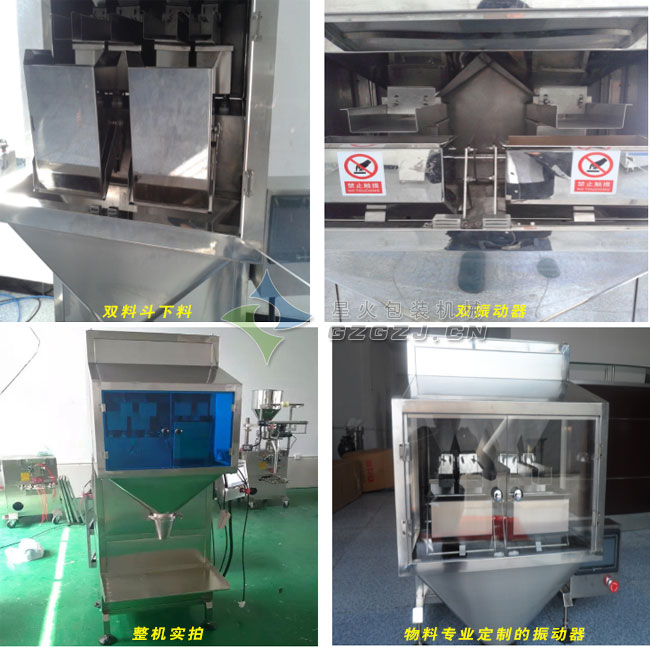 2.雙斗單稱顆粒定量包裝機采用雙振動斗給料,單稱重斗稱重,速度快。
